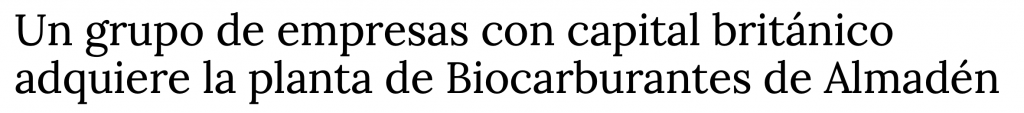 Un grupo de empresas con capital británico adquiere la planta de Biocarburantes de Almadén
